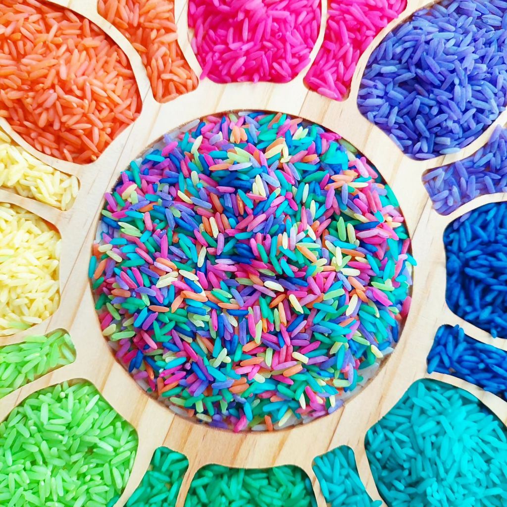 Coloured rice! Simple. Fun …… sensory play!!! Endless possibilities for all ages!