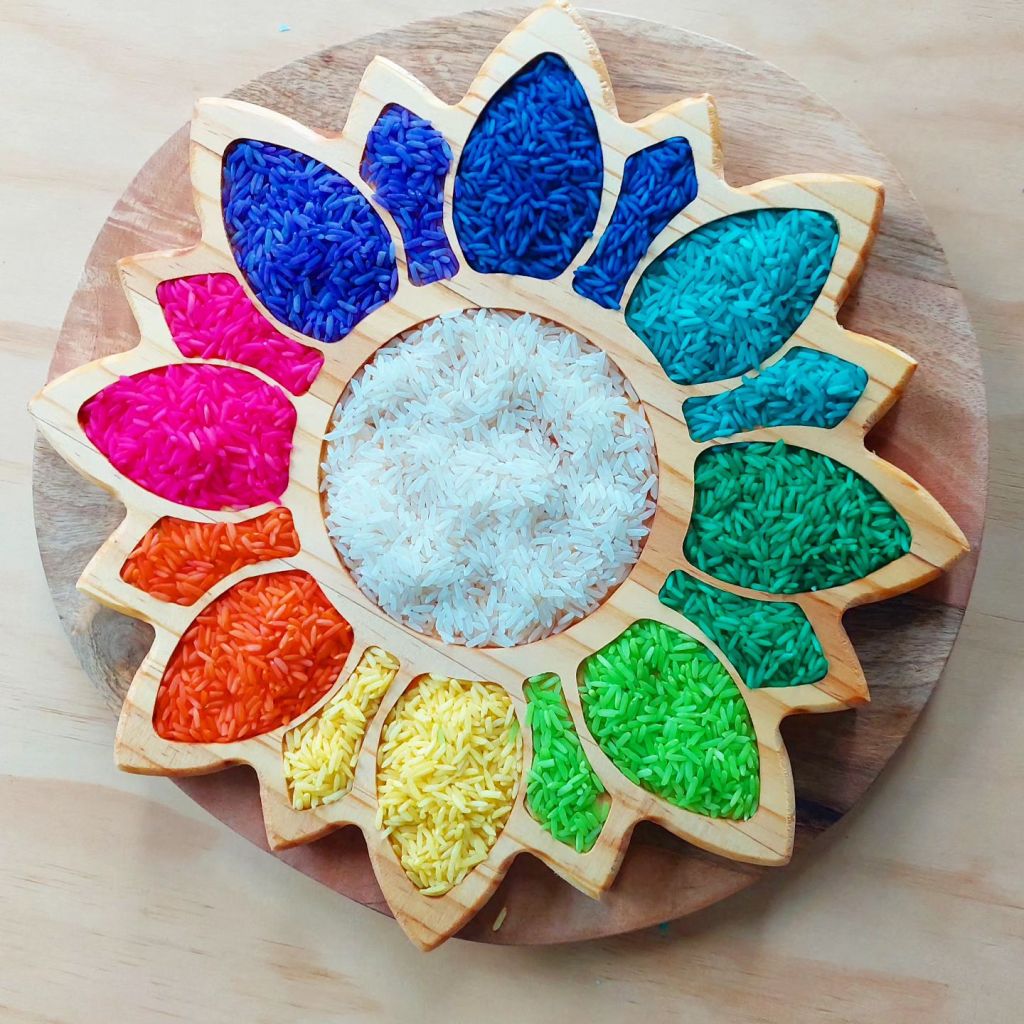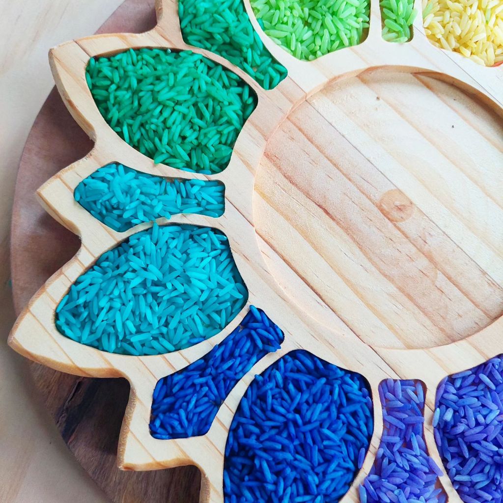 Sensory rainbow rice on flower tray