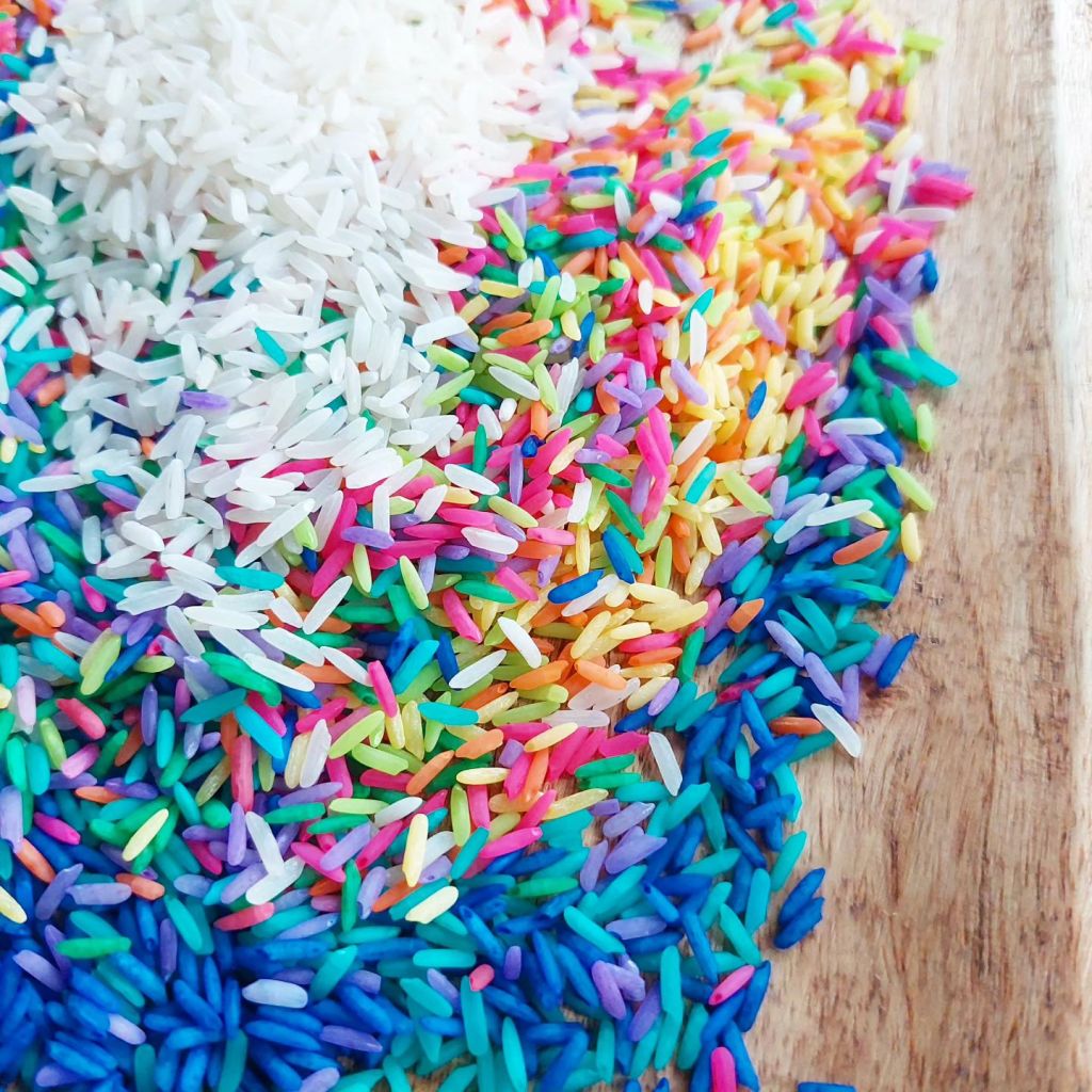 I usually don’t follow an exact recipe but combine rice, colouring & hand sanitiser and close the bag or container and shake….. shake…. shake, swooosh…. until all the rice is covered and dyed.