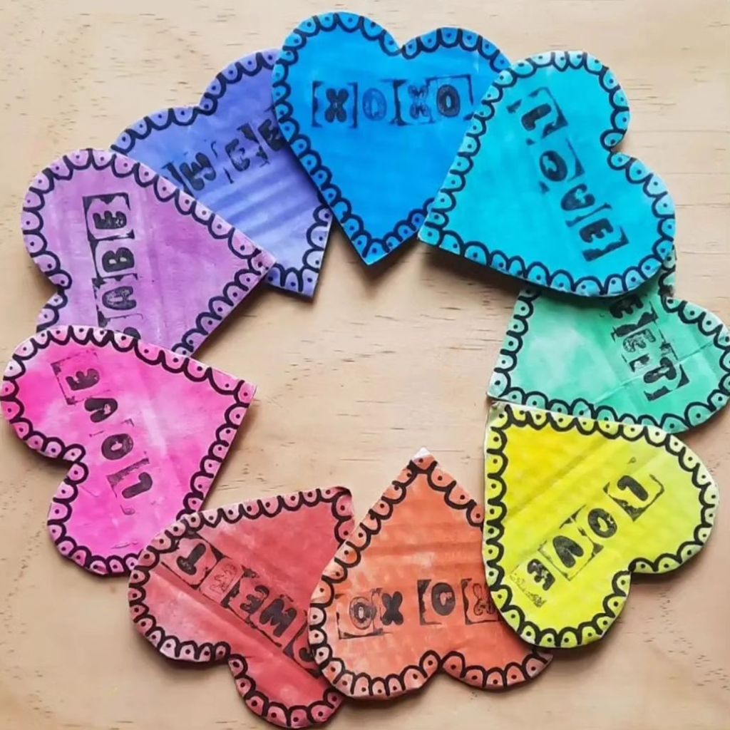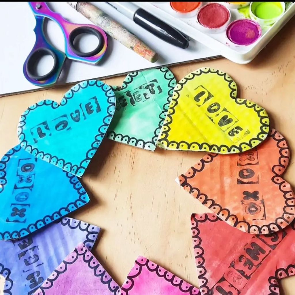 We had some boxed we cut up, used our favourite watercolours @micador and made every colour heart. We added a little cute valentine’s message using stamps from @kmart & a sharpie marker decoration.