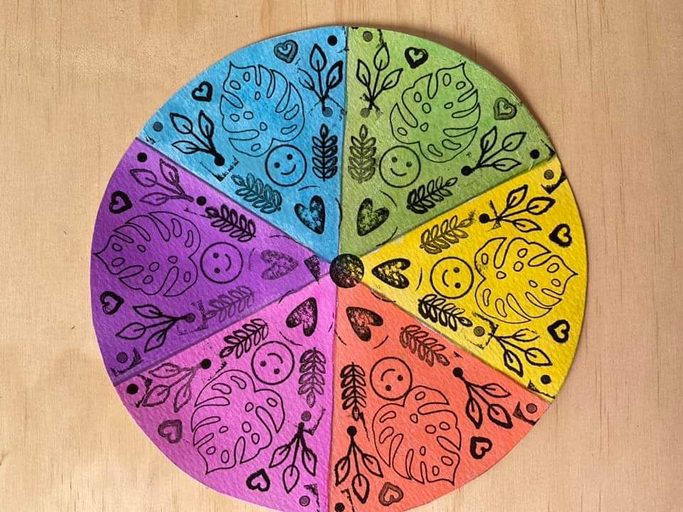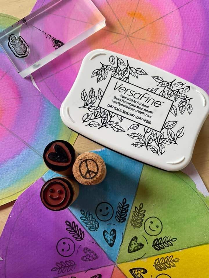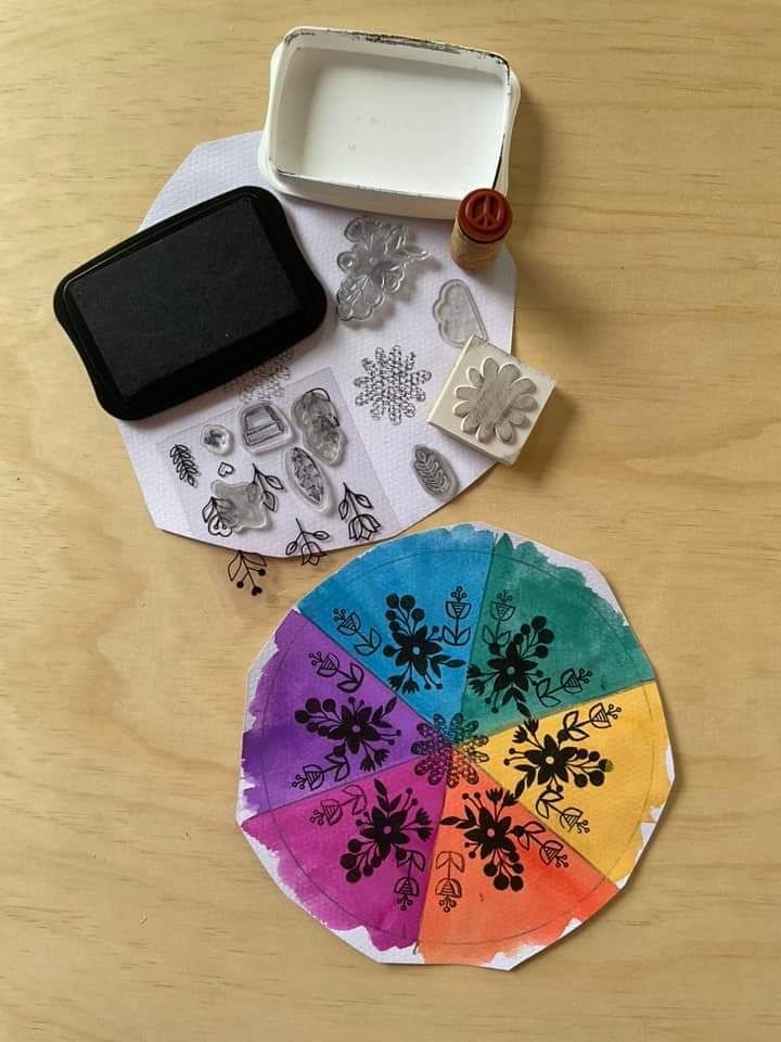 These cute little stamps are from @targetaus @kmartaus and  @Amazon we used A4 watercolour paper to draw a circle , cut out a circle,  add guides for each section and repeat the pattern.