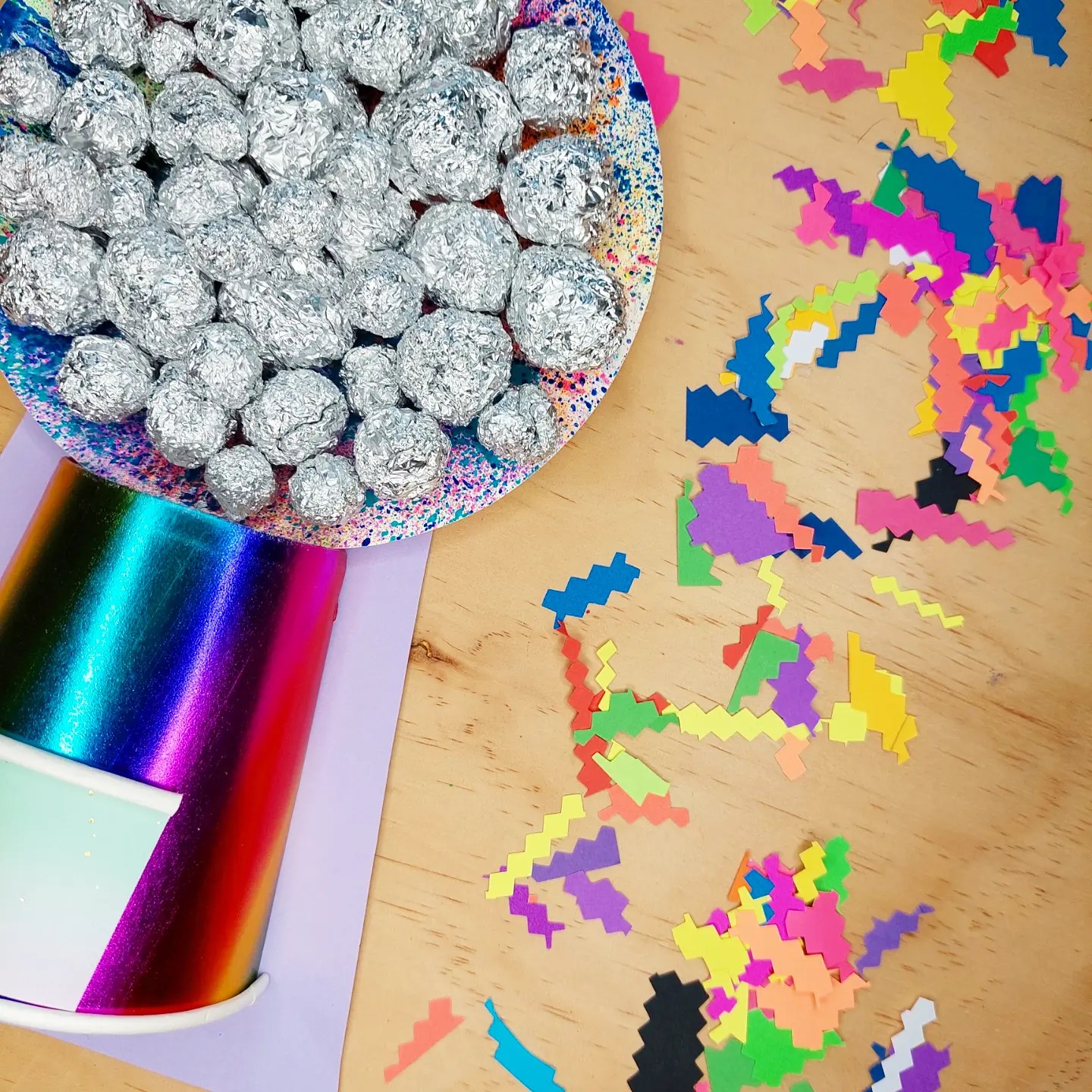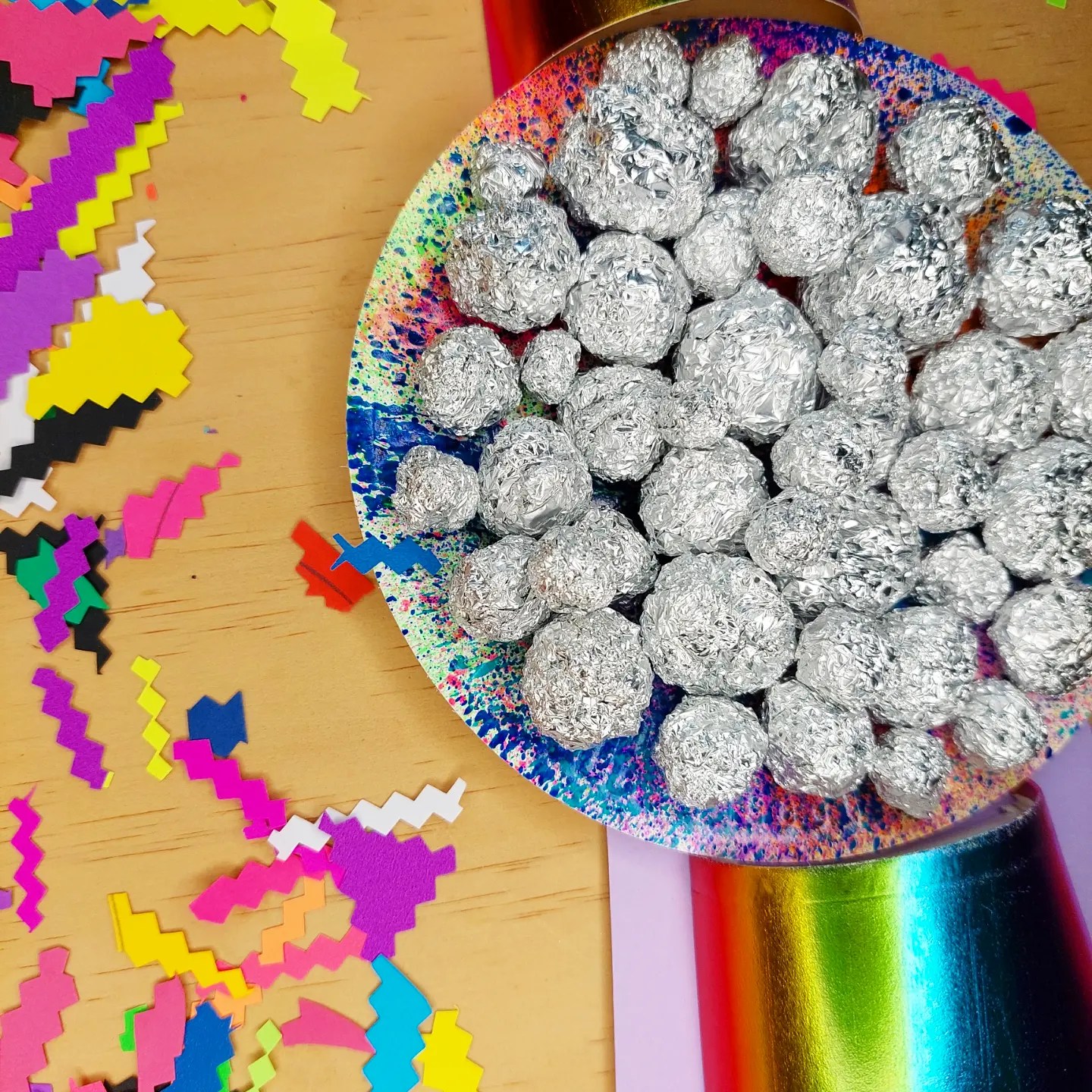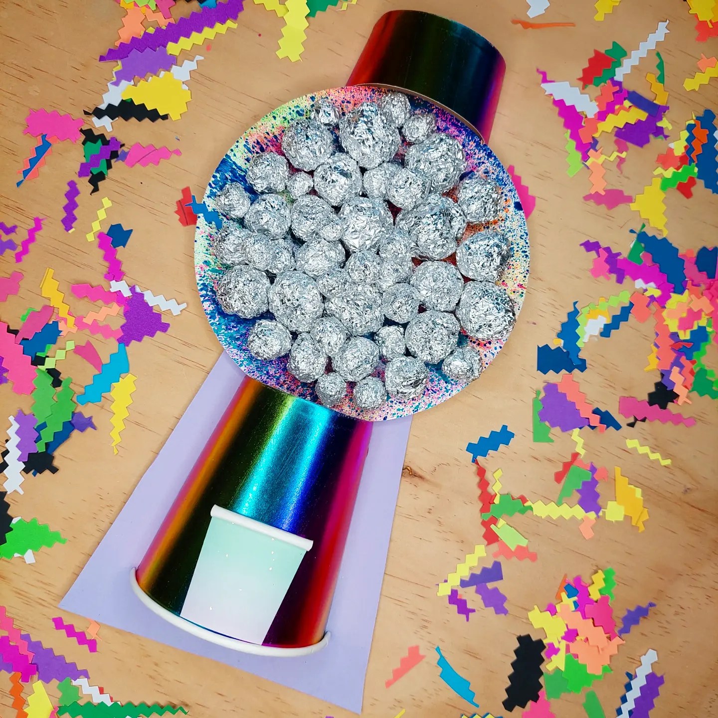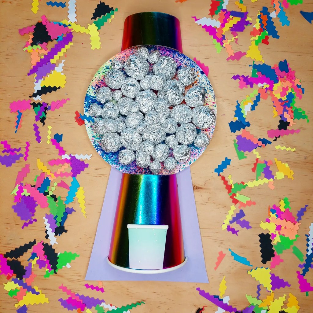 Using crepe paper and scrunching up and glueing to cardboard paper ate, upcycling and lid and gum ball dispenser…… adding to our love of rainbows!