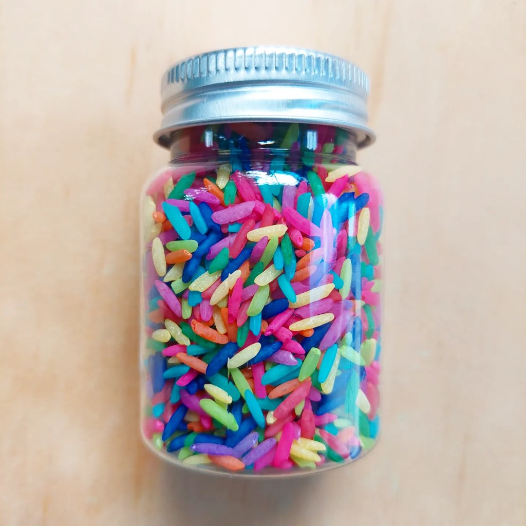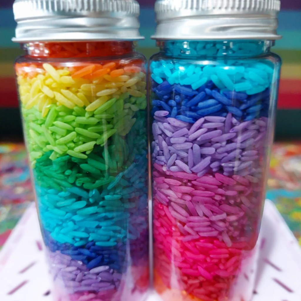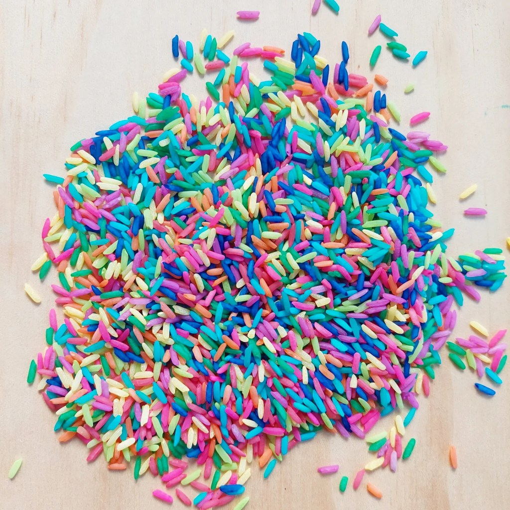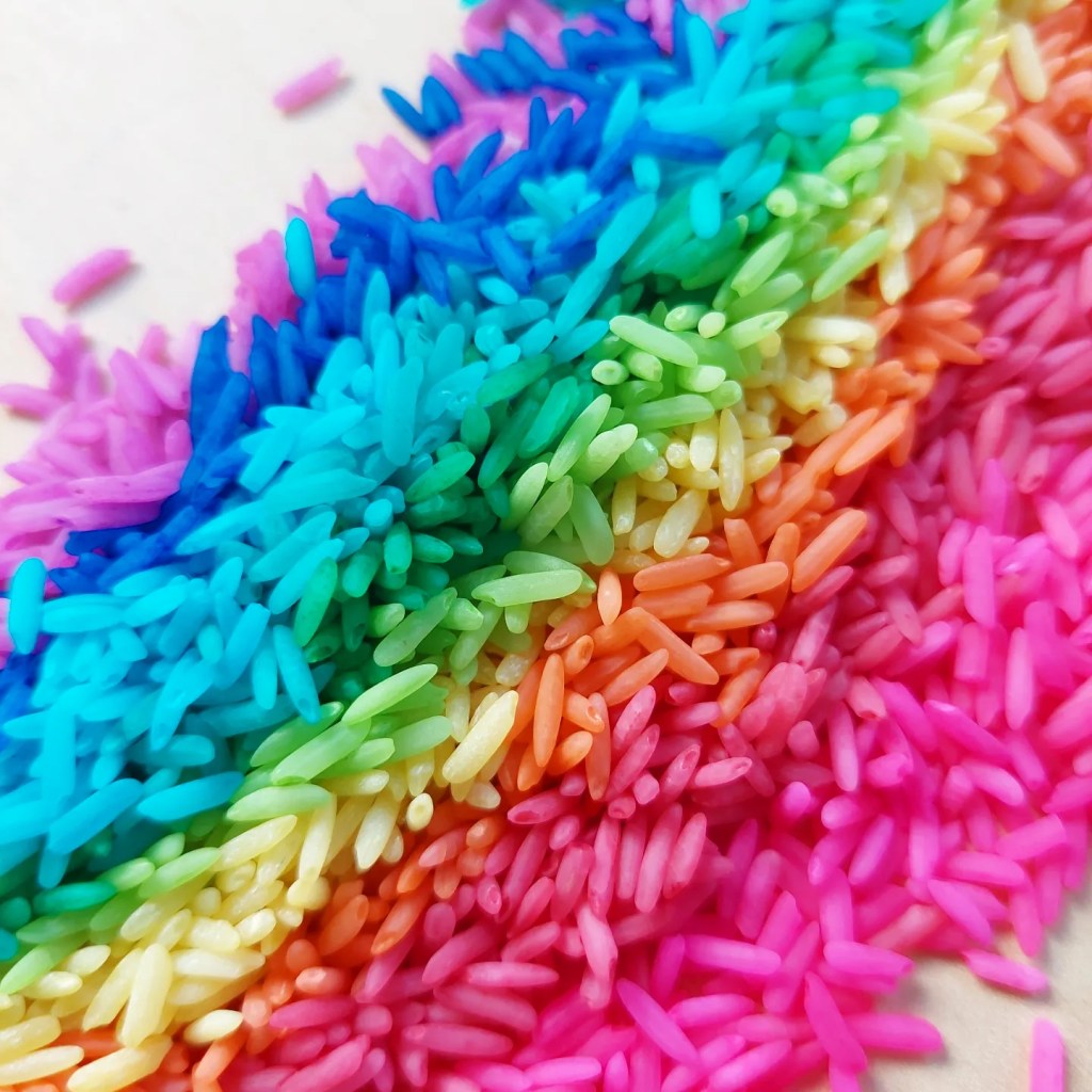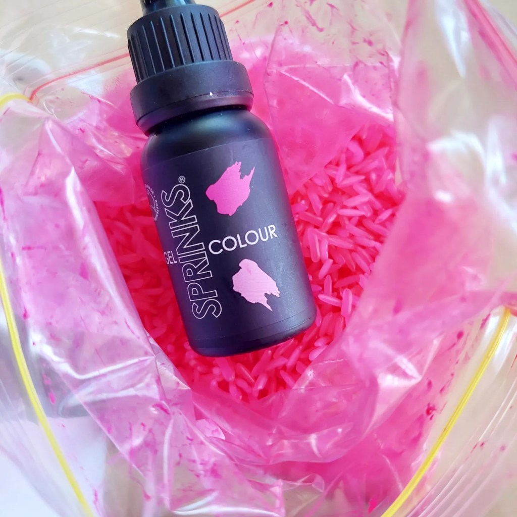 I usually don’t follow an exact recipe but combine rice, colouring & hand sanitiser and close the bag or container and shake….. shake…. shake, swooosh…. until all the rice is covered and dyed.