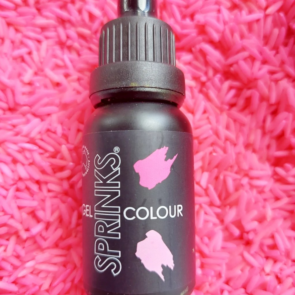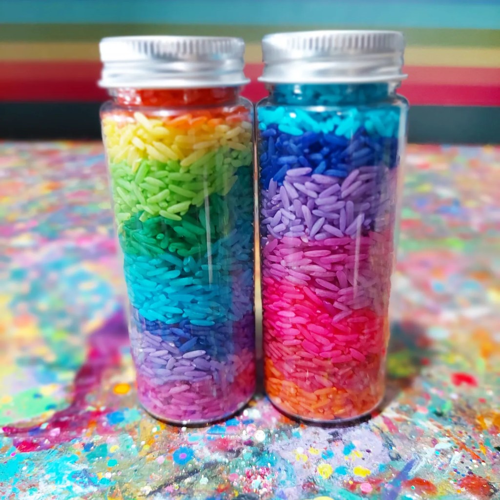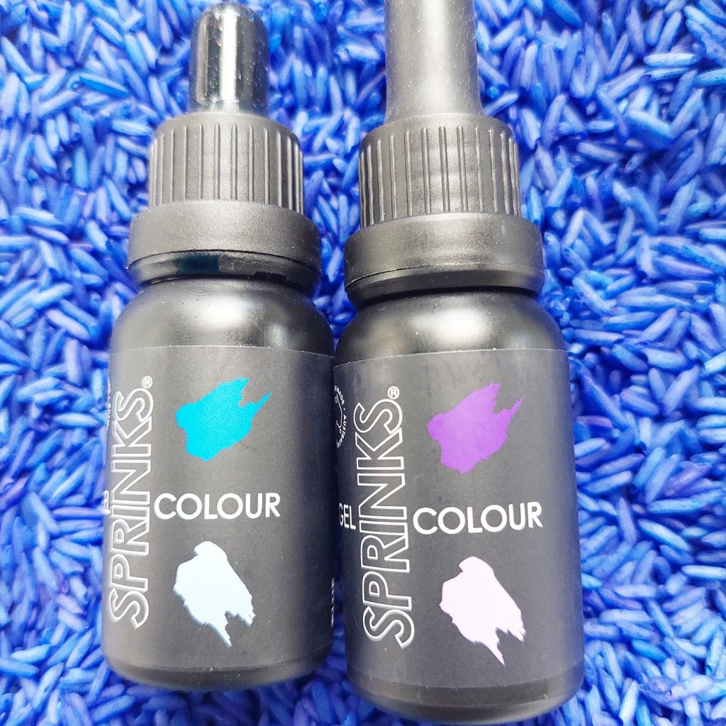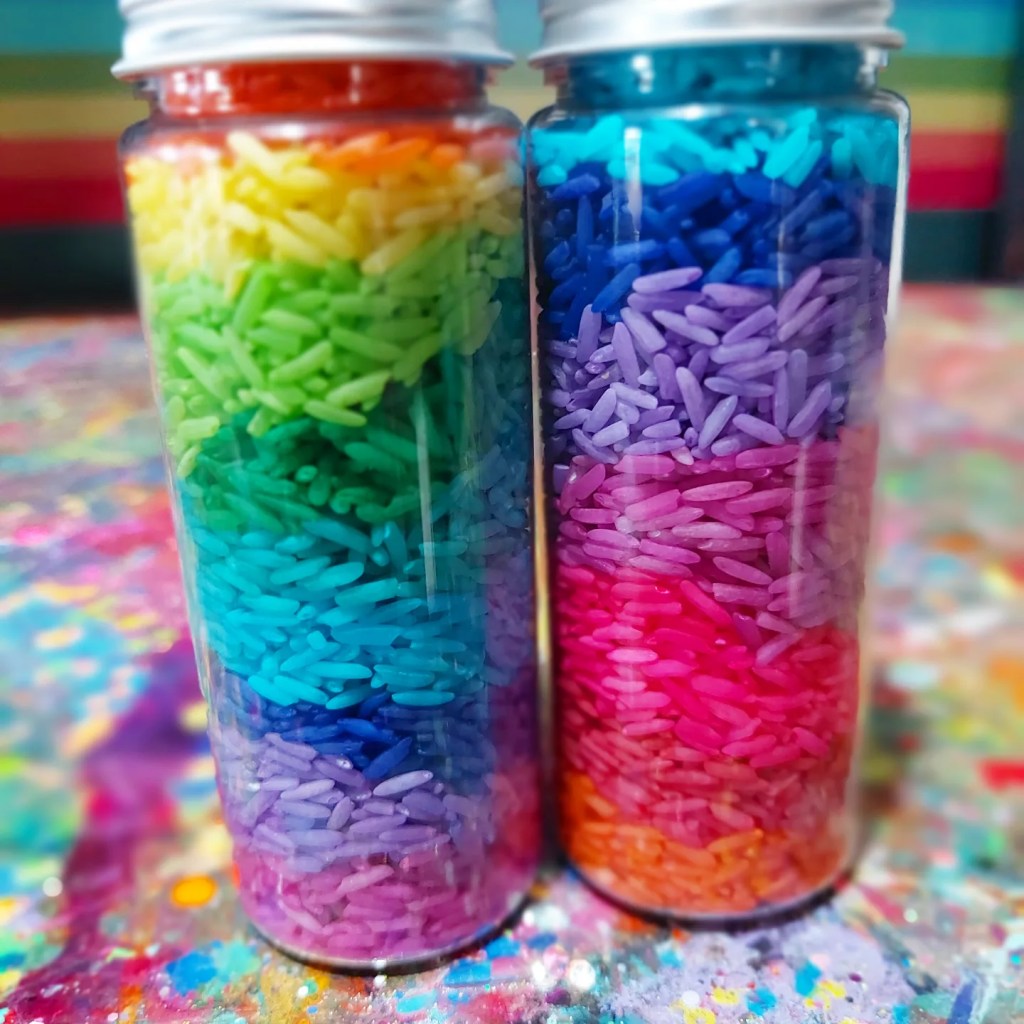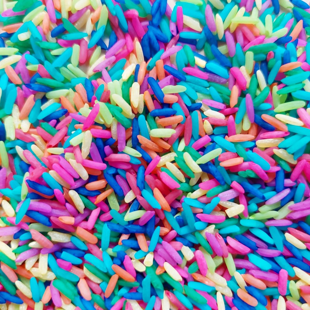 I usually don’t follow an exact recipe but combine rice, colouring & hand sanitiser and close the bag or container and shake….. shake…. shake, swooosh…. until all the rice is covered and dyed.