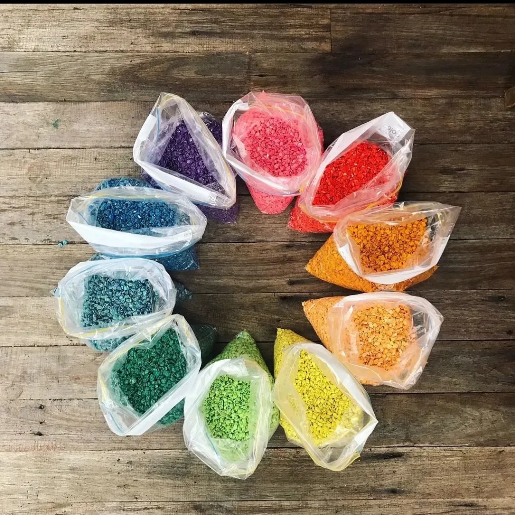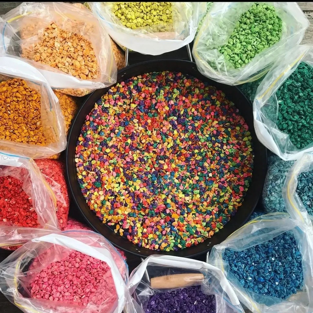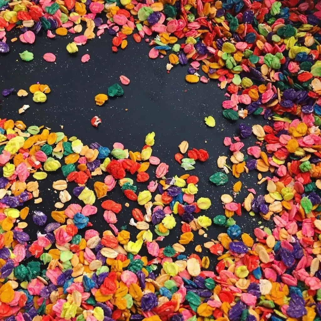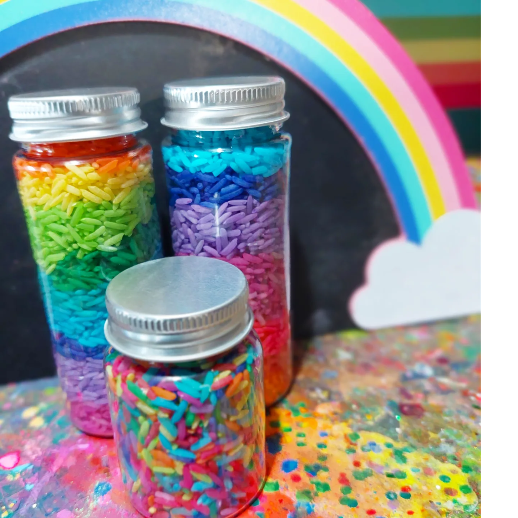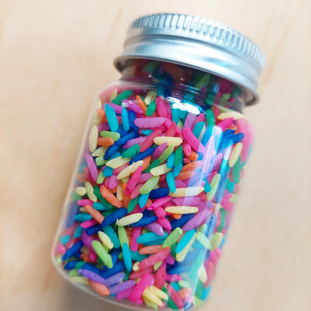 I usually don’t follow an exact recipe but combine rice, colouring & hand sanitiser and close the bag or container and shake….. shake…. shake, swooosh…. until all the rice is covered and dyed.