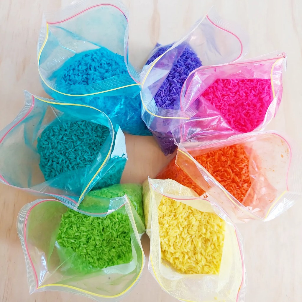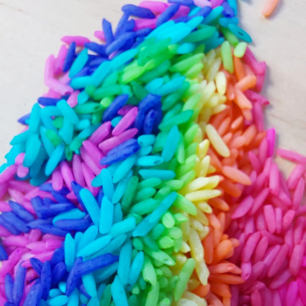 Coloured rice! Simple. Fun …… sensory play!!! Endless possibilities for all ages!
