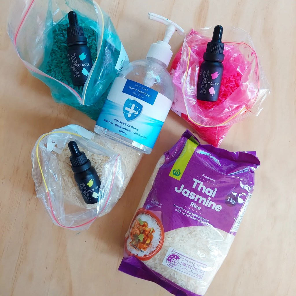 All you need is rice, a container with lid or zip lock sandwich bag, food dye, rubbing alcohol, hand sanitiser or vinegar.
